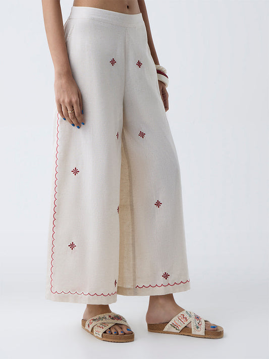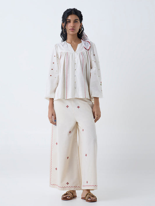 Bombay Paisley Off-White Embroidered Cotton-Blend Palazzos