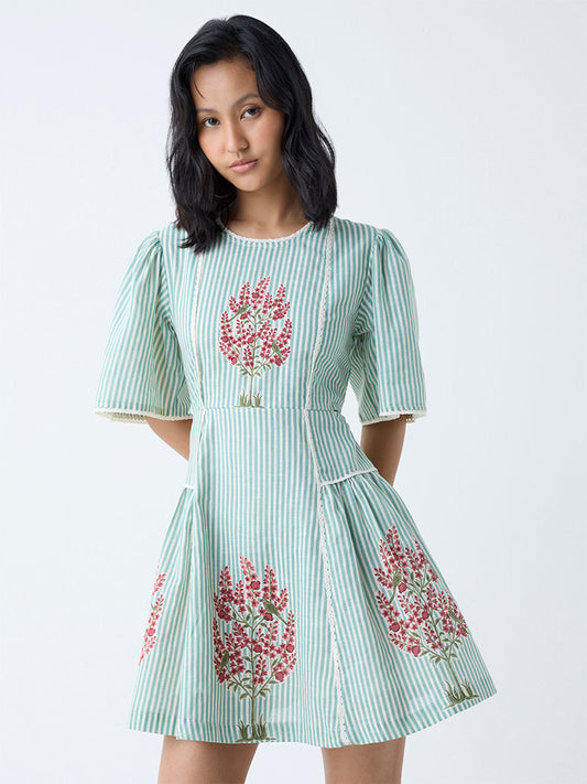 Bombay Paisley Green Floral Detailed Cotton A-Line Dress