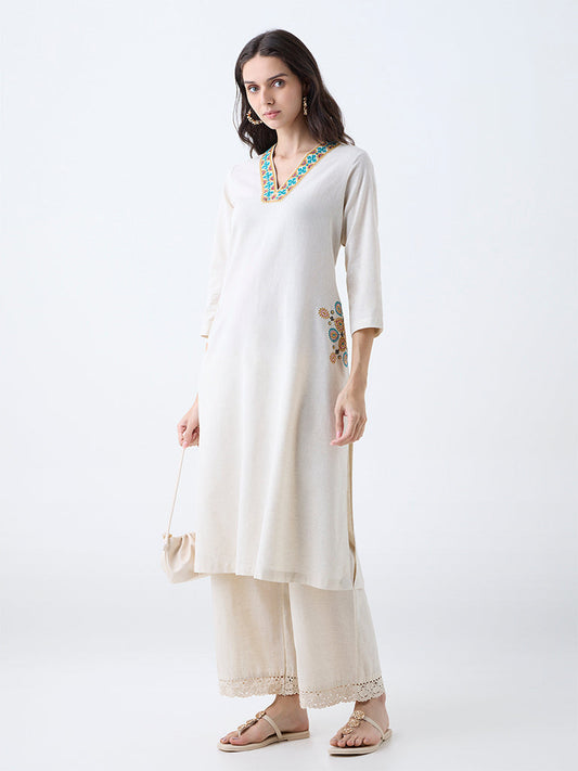 Utsa Beige Embroidered Cotton-Blend A-Line Kurta