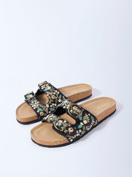 LUNA BLU Black Floral Embroidered Slip-On Sandals