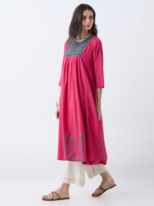 Utsa Fuchsia Embroidered Anarkali Cotton Kurta