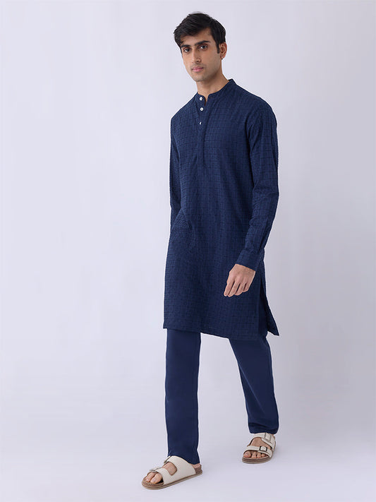 Mens Ethnicwear Navy Embroidered Relaxed-Fit Cotton Kurta