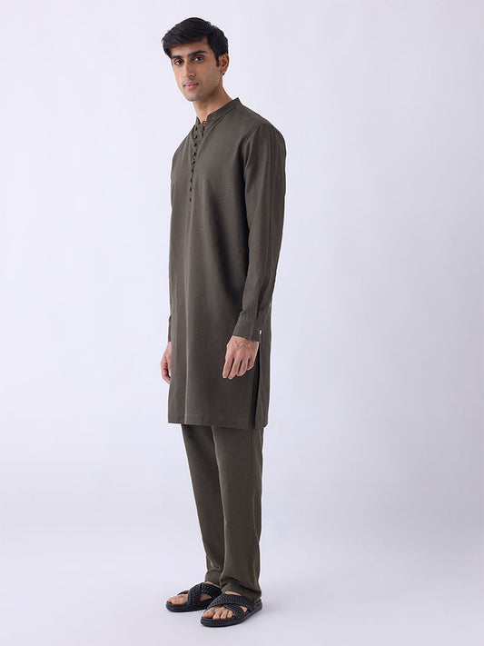Mens Ethnicwear Olive Solid Relaxed-Fit Cotton-Blend Kurta