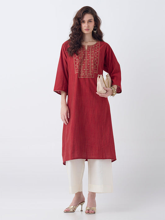 Utsa Red Floral Embroidered Cotton A-Line Kurta