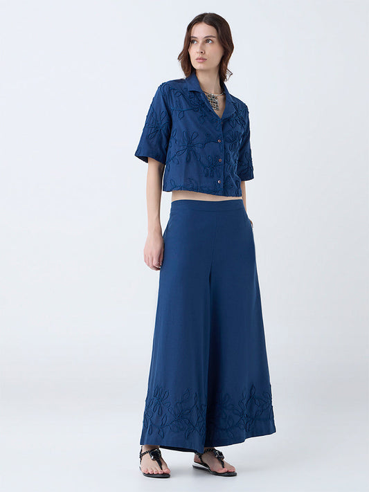 Utsa Indigo Floral Embroidered Cotton-Blend Palazzos