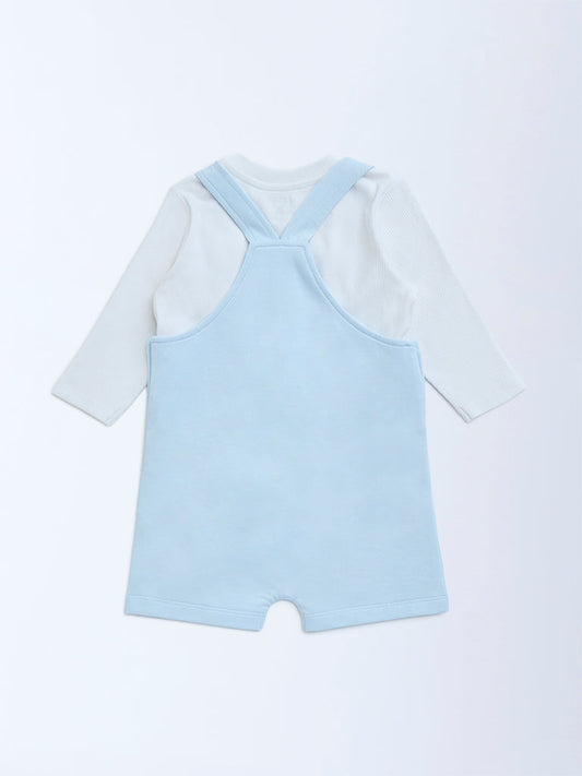 HOP Baby Blue Printed Cotton Dungaree with T-Shirt Set