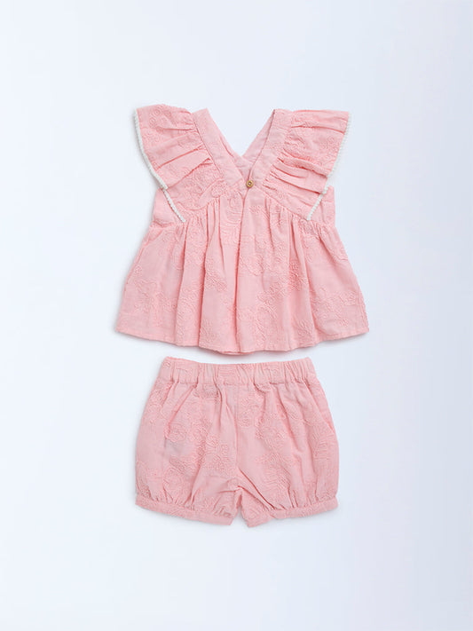 HOP Baby Pink Floral Embroidered Cotton Top and Shorts Set