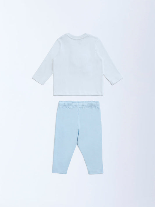 HOP Baby Light Blue Embroidered Cotton T-Shirt and Pants Set