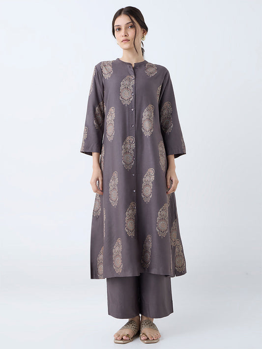 Utsa Dark Brown Leaf Pattern Cotton Straight Kurta
