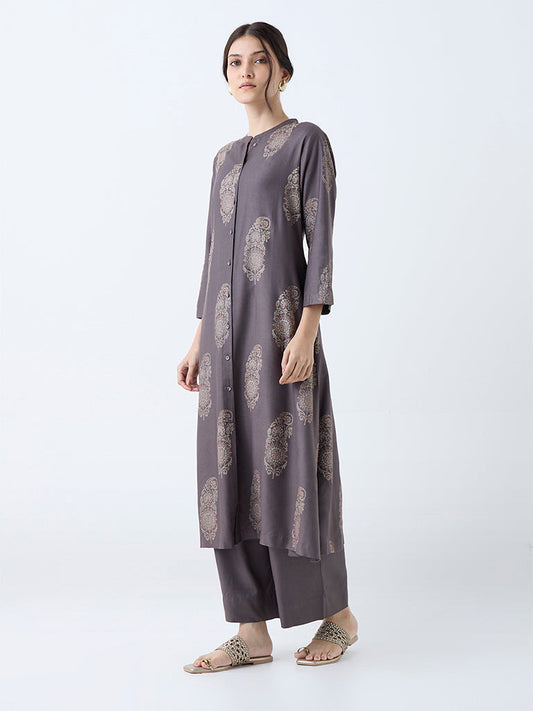 Zuba Light Brown Botanical Pattern A-Line Kurta