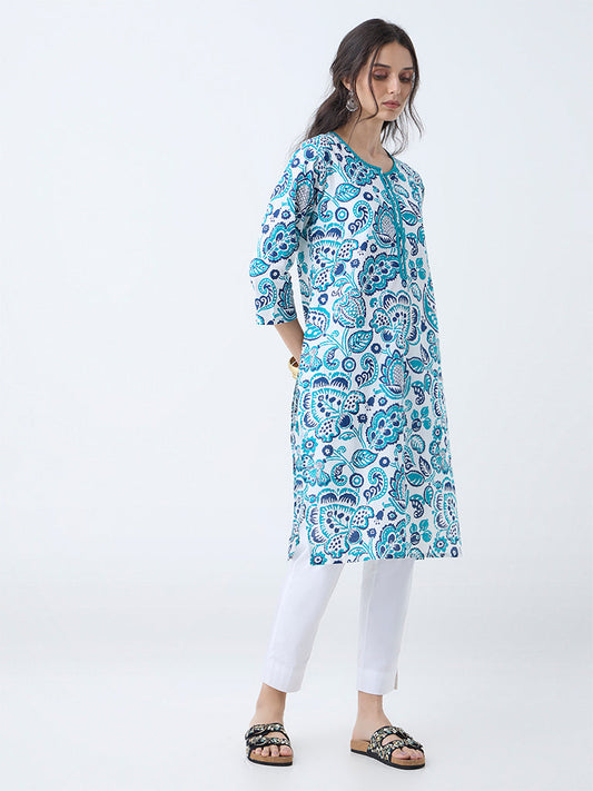 Utsa Turquoise Floral Printed Cotton Straight Kurta