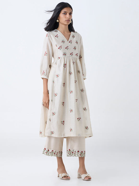 Zuba Beige Embroidered Fit-and-Flare Cotton-Blend Kurta