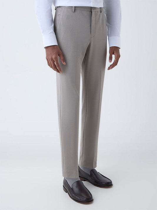 WES Formals Taupe Solid Slim-Tapered Fit Mid-Rise Trousers