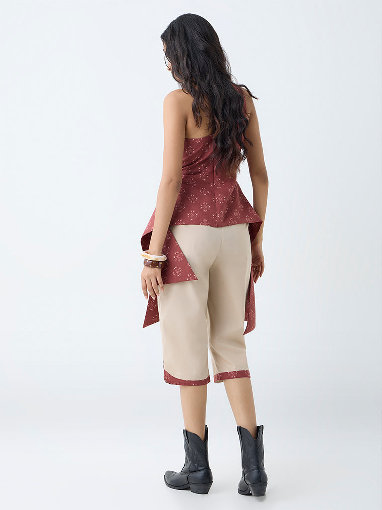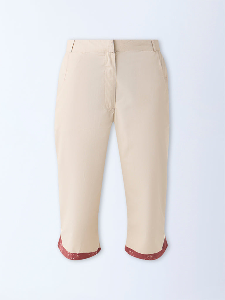 These beige capris from Westside's Young New Gamechanger initiative are designed by Manvi G, an emerging talent from NIFT Bengaluru. Inspired by The Navagunjara - blending mystical symbolism with modern artistry. The capris seamlessly blend modern wearability with subtle cultural influences. Expertly tailored from pure cotton, they feature an elegant silhouette with a secure buttoned waistband, belt loops, and side pockets for practical everyday comfort. Distinctive patterned cuffs at the hem add a sophisticated, contemporary accent to this versatile design.