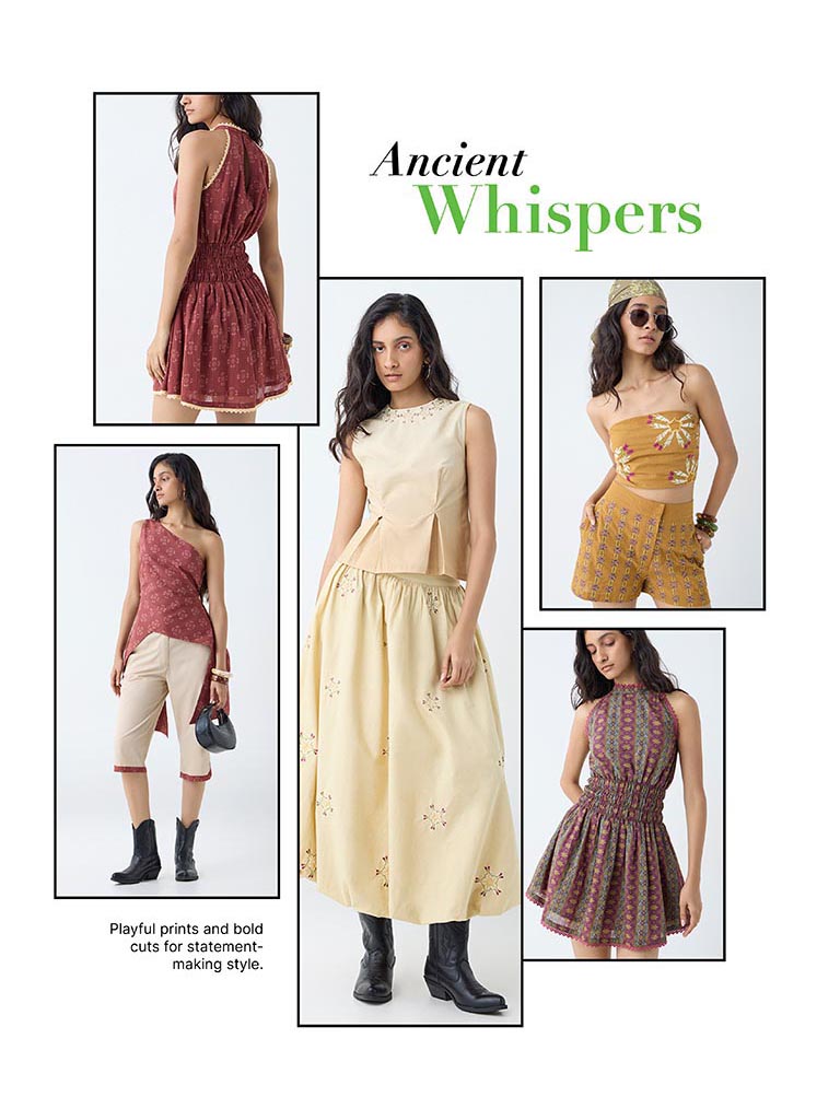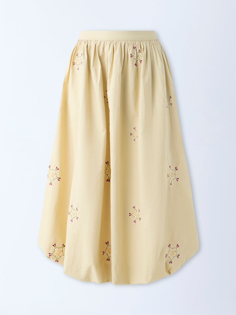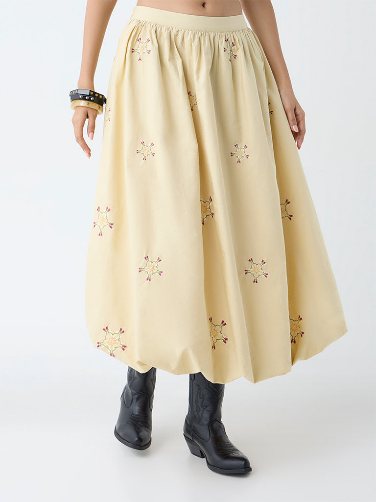 This beige skirt from Westside's Young New Gamechanger initiative is designed by Manvi G, a rising talent from NIFT Bengaluru. Inspired by The Navagunjara - blending mystical symbolism with modern artistry. The skirt artfully combines cultural elegance with modern functionality. Crafted from a cotton-blend fabric, it showcases delicate floral embroidery across a voluminous bubble silhouette, complemented by an elasticated waistband and practical side pockets for easy everyday wear.