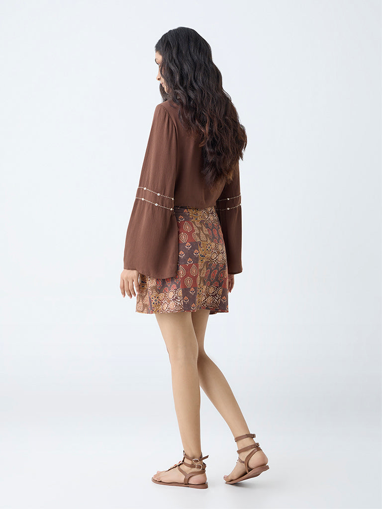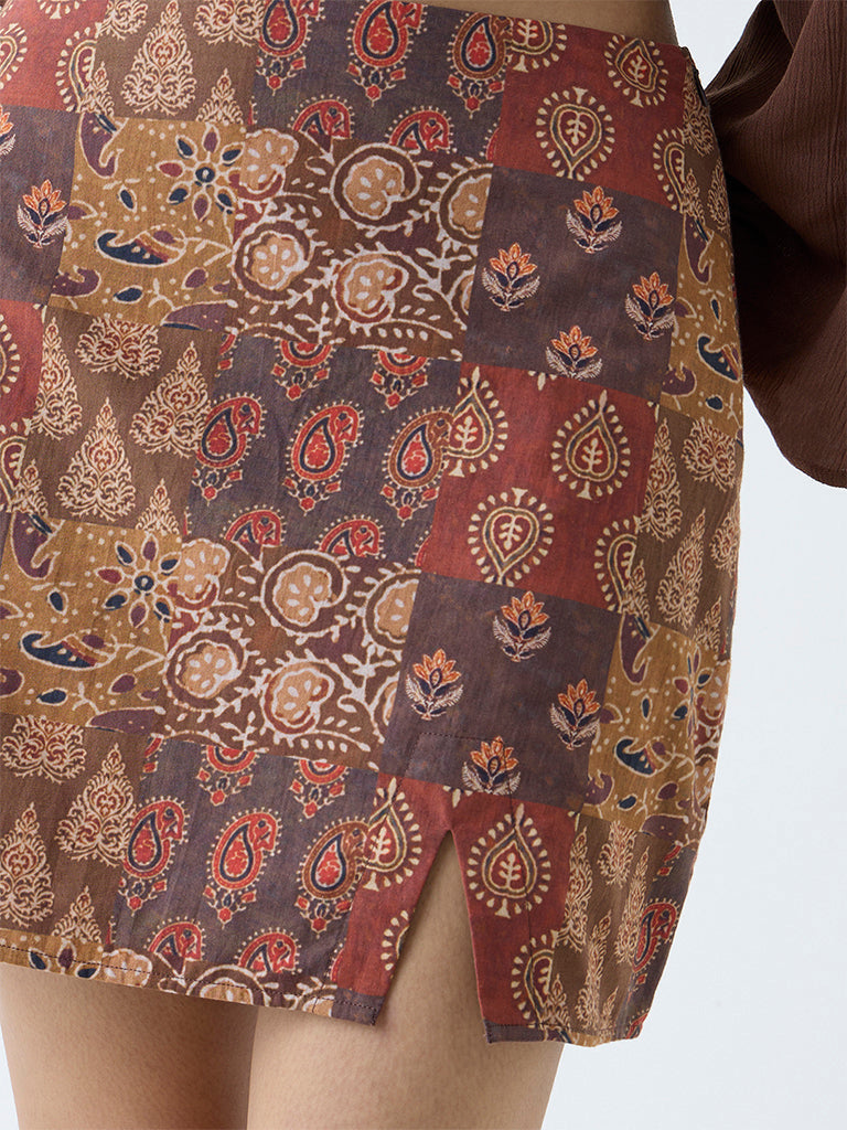 This brown skirt from Westside's Young New Gamechanger initiative is designed by Sahana, an emerging talent from NIFT Bengaluru. Influenced by The Aangan - a space reflecting harmony and tradition - the skirt seamlessly blends cultural artistry with contemporary wearability. Made from pure cotton, it features lively block-patterned motifs, an elasticated waistband, and a cleverly concealed zipper, ensuring stylish comfort for versatile everyday looks.