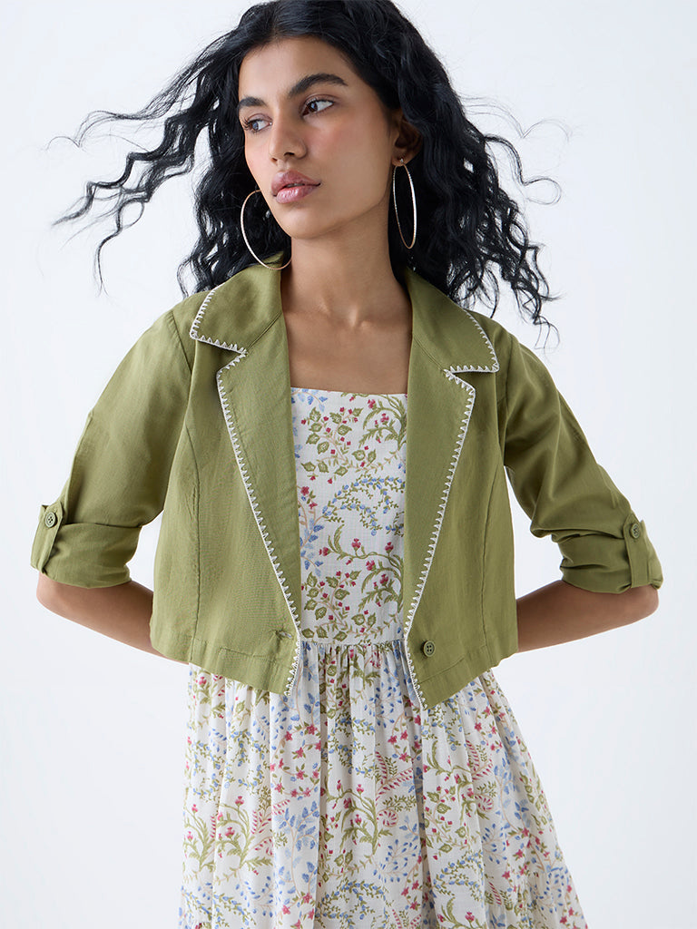 Shaped in a breezy tiered silhouette, this off-white dress from Bombay Paisley is adorned with dainty floral prints for feminine charm. Spun from pure cotton, it features a square neck, adjustable straps, and a smocked back for a flattering fit. Paired with a sage jacket, this ensemble will effortlessly elevate your ensemble.