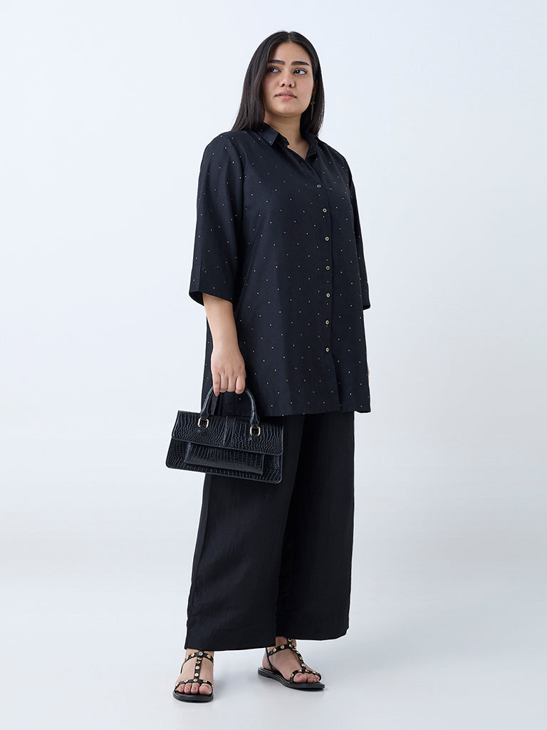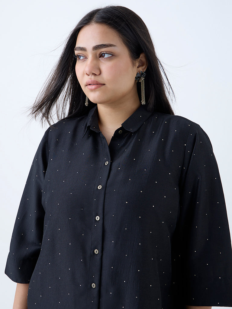 Diza introduces this black tunic, detailed with shimmering badla prints that add a subtle festive sheen. Crafted from a sumptuous fabric, it features a structured collar, a button-up front and three-quarter sleeves for a polished look.