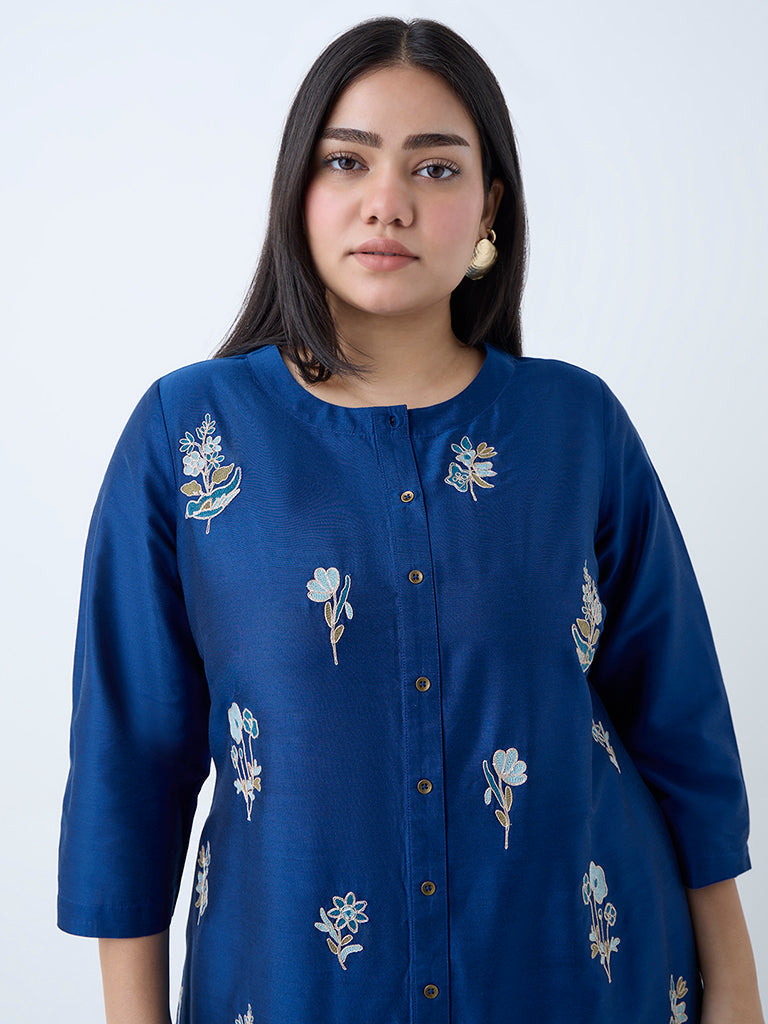 Revamp your festive edit with this blue kurta from Diza. Showcasing floral embroidery for a chic touch, this A-line silhouette is styled with a band collar, a buttoned placket and three-quarter sleeves.