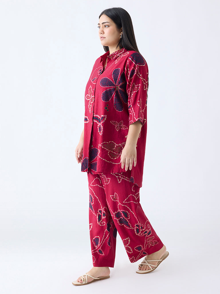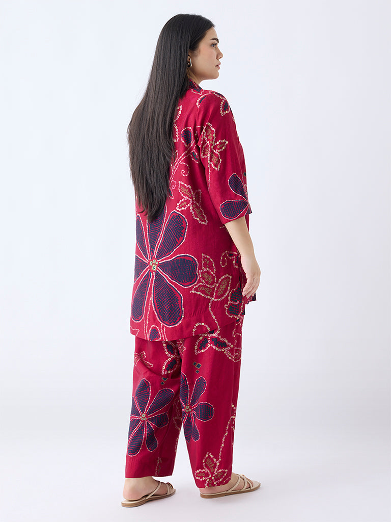 Give your ethnic rotation a modern twist with this red tunic from Diza. Flaunting bandhani-inspired floral prints, this high-low style gives a chic look with matching palazzos (sold separately)