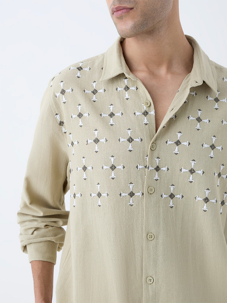 This beige shirt is part of the Young New Gamechanger initiative by Westside. Inspired by The Karigar - inspired by India's timeless crafts, shaping heritage for today. It's an artistic creation by Mark R, a rising talent from NIFT Bengaluru. Crafted from a comfortable cotton-rich fabric, this shirt stands out with its intricate, abstract embroidery across the chest and shoulders. The relaxed silhouette, spread collar, and full sleeves offer a contemporary yet comfortable look, while the front button-up detail completes this versatile piece, making it a perfect addition to your wardrobe.