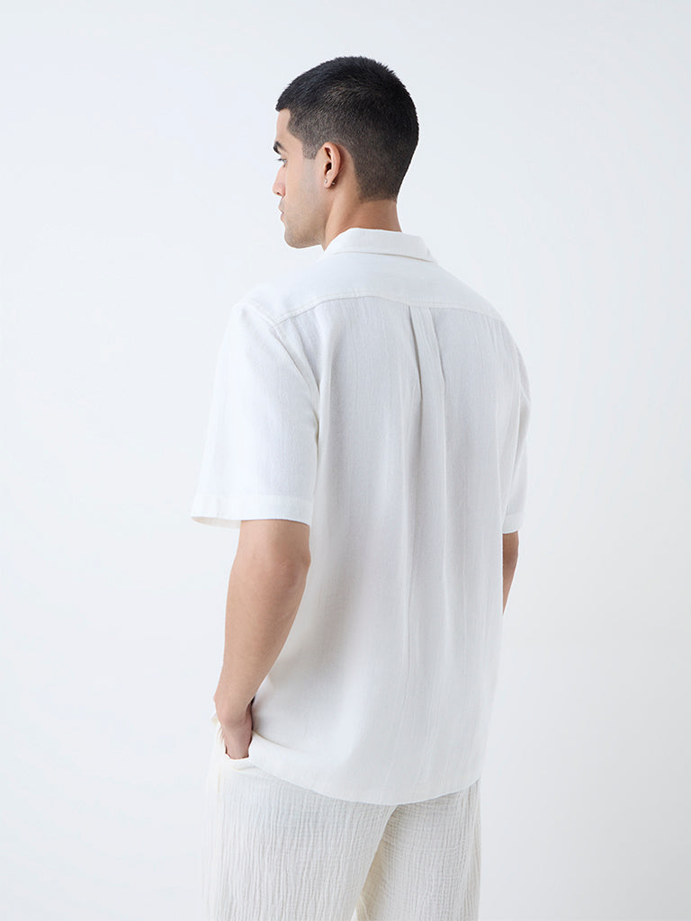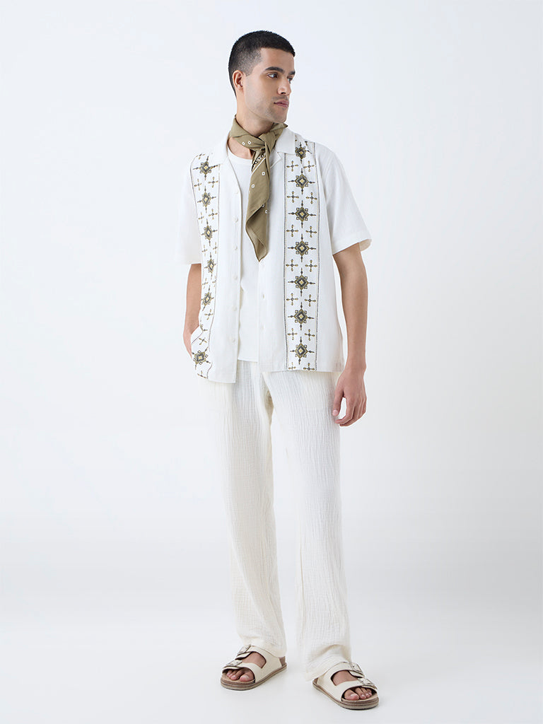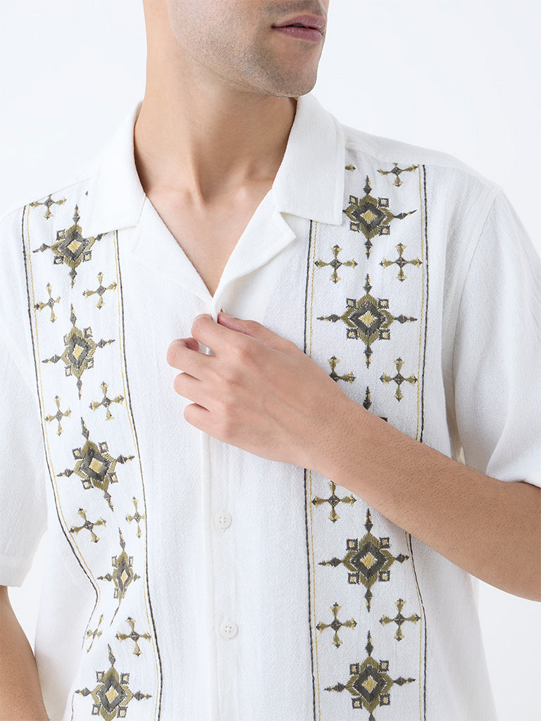 This off-white shirt is part of the exclusive Young New Gamechanger collection for Westside. Created by Mark R, an emerging designer from NIFT Bengaluru. Inspired by The Karigar - inspired by India's timeless crafts, shaping heritage for today. Made from a breathable cotton fabric, this shirt features a relaxed silhouette and a stylish camp collar. Its unique design is elevated by intricate, vertical panels of embroidery, ensuring you make a statement with every wear. Finished with a button-up front and short sleeves, this shirt is the perfect balance of artistic expression and laid-back comfort.