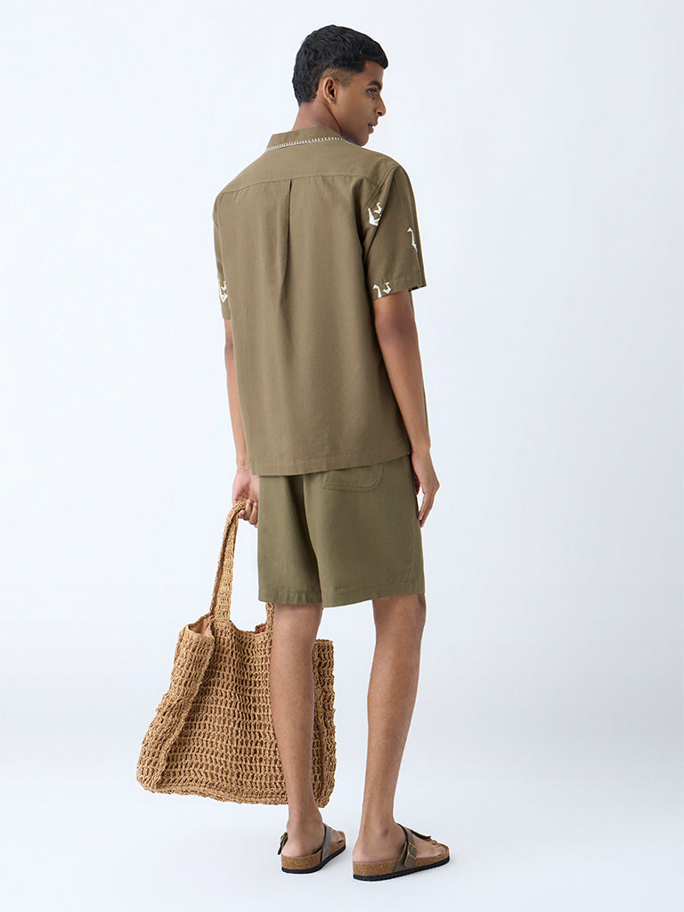 ETA Olive Solid Relaxed-Fit Mid-Rise Cotton-Blend Shorts