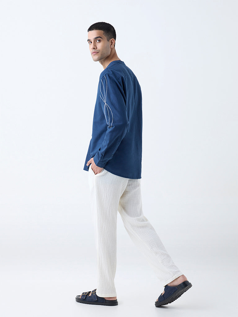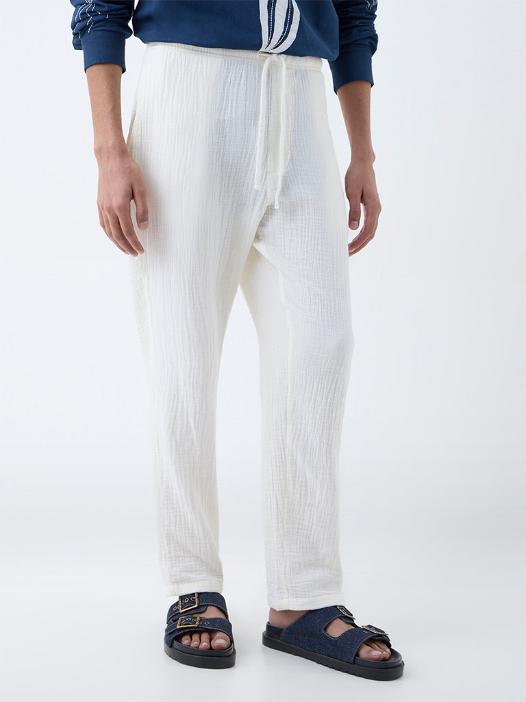 These white pants from Westside's Young New Gamechanger initiative are designed by Harshita, an emerging talent from NIFT Bengaluru. Inspired by The Geoflow - inspired by nature's curves and crafted geometry, flowing into modern design. The collection skillfully balances cultural elements with modern comfort. Crafted from a cotton fabric with a soft crinkle texture, these pants feature an elastic waistband with adjustable drawstrings and practical side pockets, making them ideal for everyday ease and effortless sophistication.