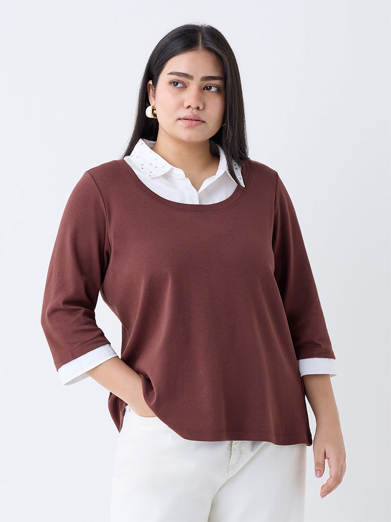 Update your casual wardrobe with this brown cotton t-shirt from Gia. Designed with a classic round neck and full sleeves, it stands out with an attached embellished notched collar that adds a touch of elegance. Crafted from soft, breathable cotton, it offers all-day comfort with effortless style.