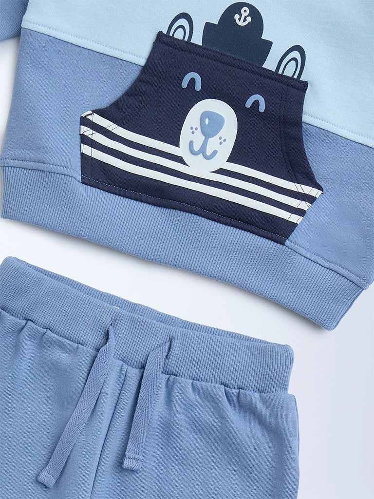 This blue co-ord set from HOP Baby showcases a colour-blocked design with a playful bear and anchor motif across the front. Styled with a round neck and long sleeves, the top balances style with ease. The matching pants are detailed with an elasticated waist and drawstring ties to provide a secure and flexible fit. Crafted from cotton-rich fabric, the set ensures lasting comfort for little ones.