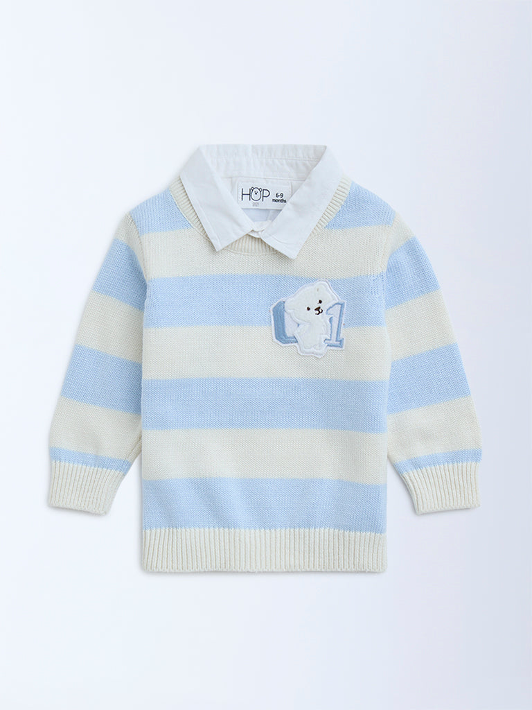 Wrap your little one in cozy charm with this blue sweater from HOP Baby. Spun from pure cotton, it is decked with pastel stripes and a playful bear patch on the chest for an irresistible touch. Full sleeves keep tiny arms warm, while the attached collar adds a layered detail.