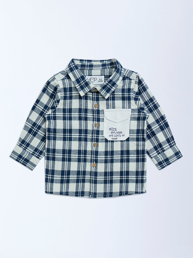 Add a smart touch to your little one’s casual style with this navy checked shirt from HOP Baby. Created from pure cotton for all-day comfort, it’s designed with a classic collar, button placket, and full sleeves for a neat finish. A chest pocket accented with playful text print brings in a hint of cuteness, making it a perfect pick for daily charm.