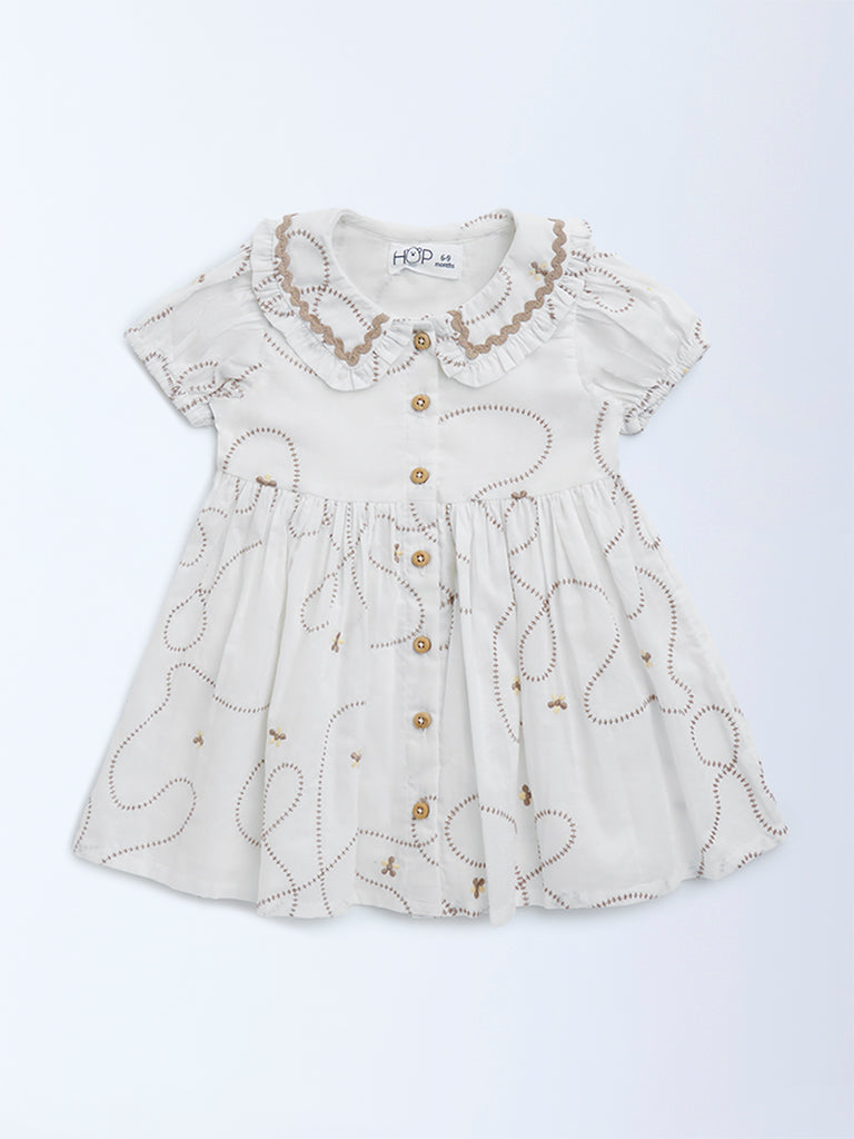 HOP Baby launches this white cotton dress tailored in an A-line silhouette. Embroidered with playful bee motifs, it is styled with a peter pan collar edged in ruffles and puff sleeves for a classic touch. The front button placket completes the design, making it a sweet choice for everyday wear.