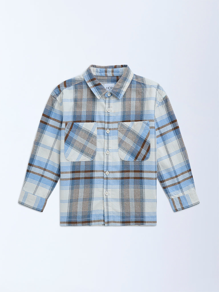 HOP Kids brings this blue shirt patterned with classic checks while the back is finished with a bold baseball-inspired graphic for playful appeal. Woven from breathable cotton, it is styled with a straight-point collar, button-up front and full sleeves. Twin flap pockets at the chest add a functional touch.