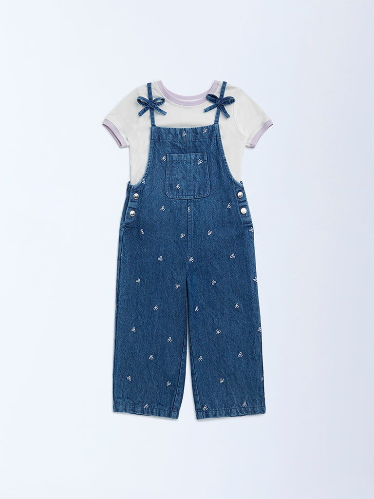 HOP Kids Blue Embroidered Denim Dungaree with T-Shirt Set