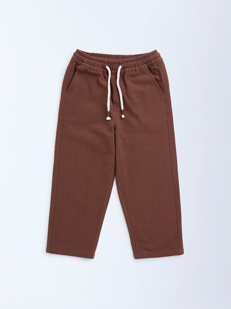 HOP Kids Brown Solid Mid-Rise Cotton Trousers