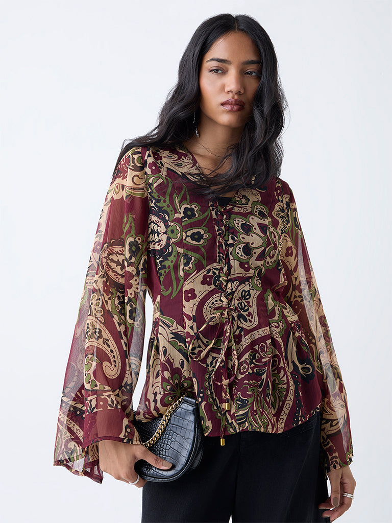 LOV Burgundy Printed Cotton Top with Camisole