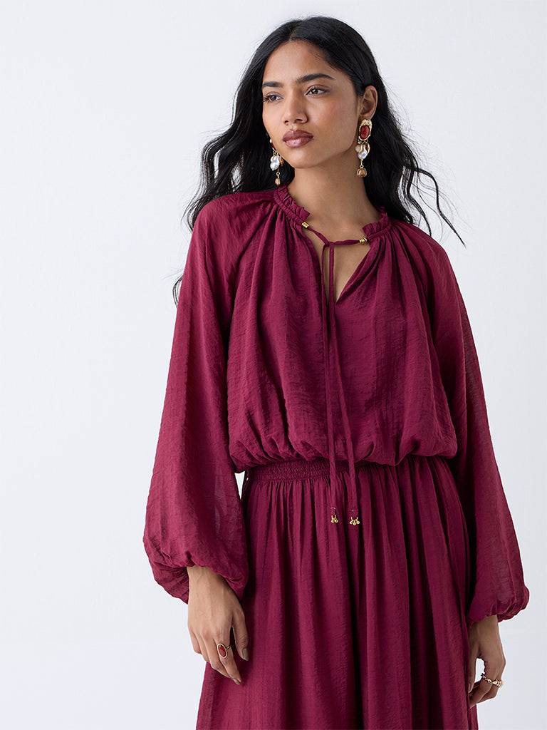 Say goodbye to wardrobe dilemmas with this burgundy top by LOV that instantly elevates any look. The crinkled fabric breathes with movement, while a ruched split neck with tie-up detail and balloon sleeves add personality that doesn’t compromise on comfort. An elasticated waistband sculpts subtly, so you feel poised whether running errands or meeting friends.