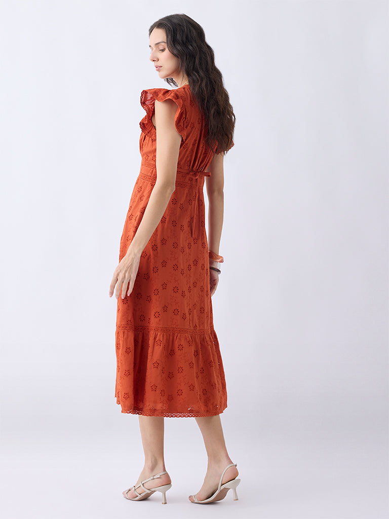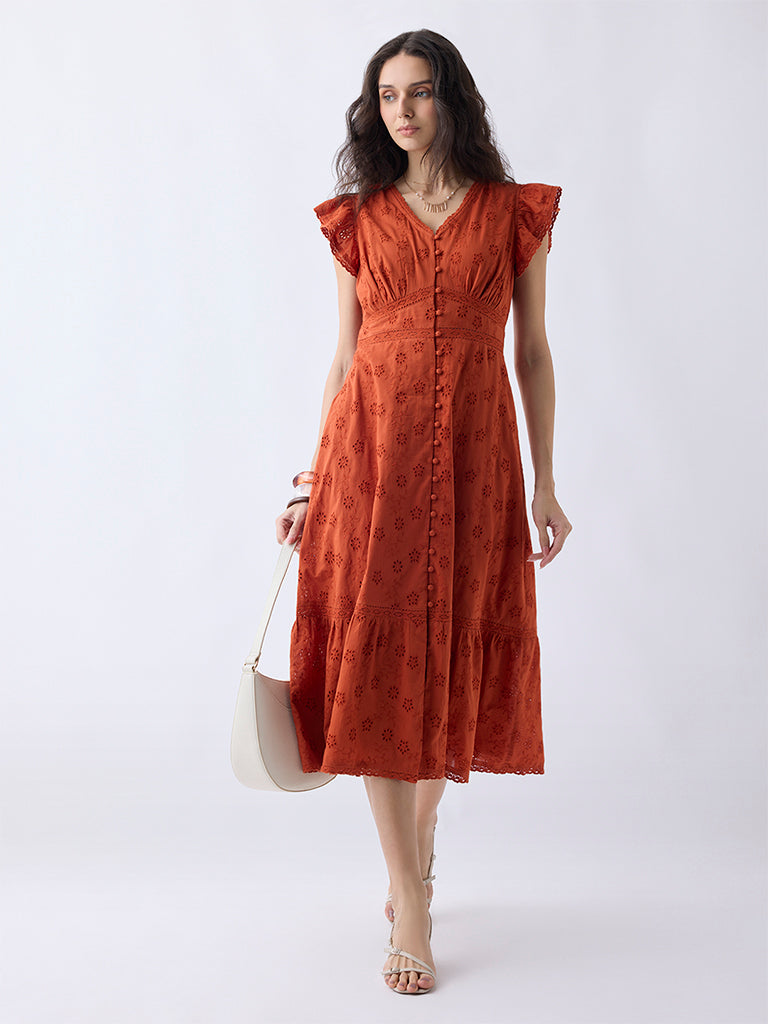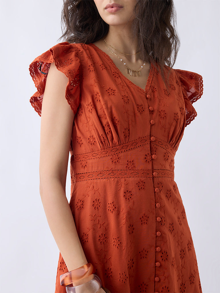 LOV Orange Floral Embroidered Cotton A-Line Dress