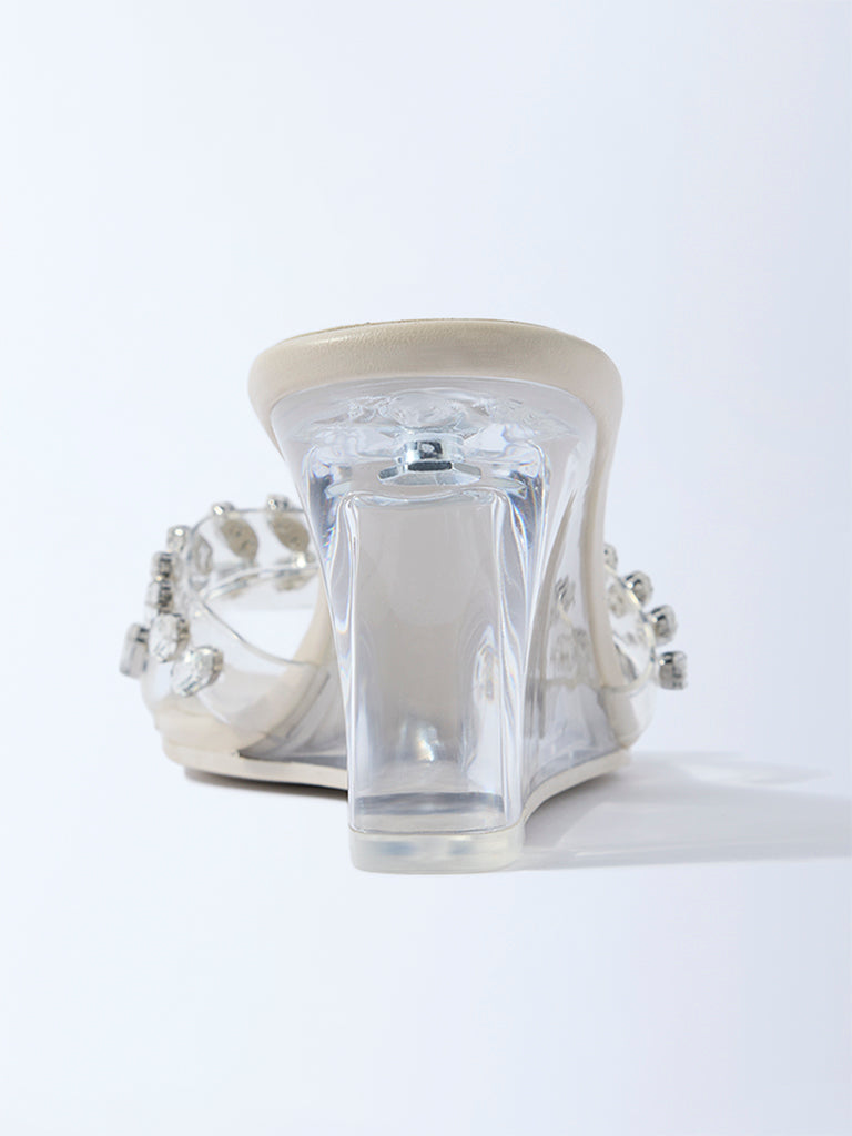 These ivory sandals from Luna Blu are crafted with vinyl straps detailed with faceted gemstones that add a hint of sparkle without overpowering the design. The clear wedge heel enhances the design, while the square-toe silhouette lends a modern edge. Finished with a soft footbed and a textured outsole, they are designed to take you from intimate celebrations to chic soirées with ease.