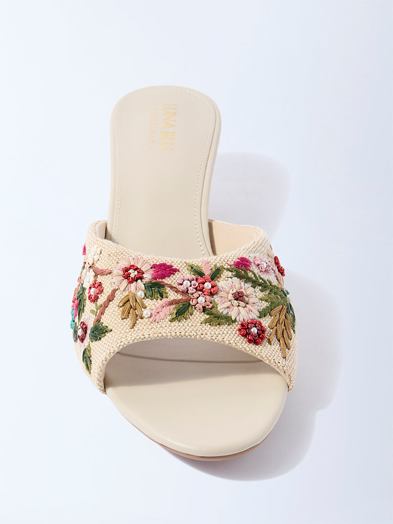 Step into elegance with these multicolour embroidered sandals from Luna Blu. Designed with intricate floral embroidery across a neutral base, they add a charming pop of colour to your look. The open-toe design and comfortable mid-heel make them perfect for pairing with both festive ensembles and chic casual outfits. Finished with a transparent block heel for a modern twist, these sandals beautifully balance style, comfort, and sophistication.
