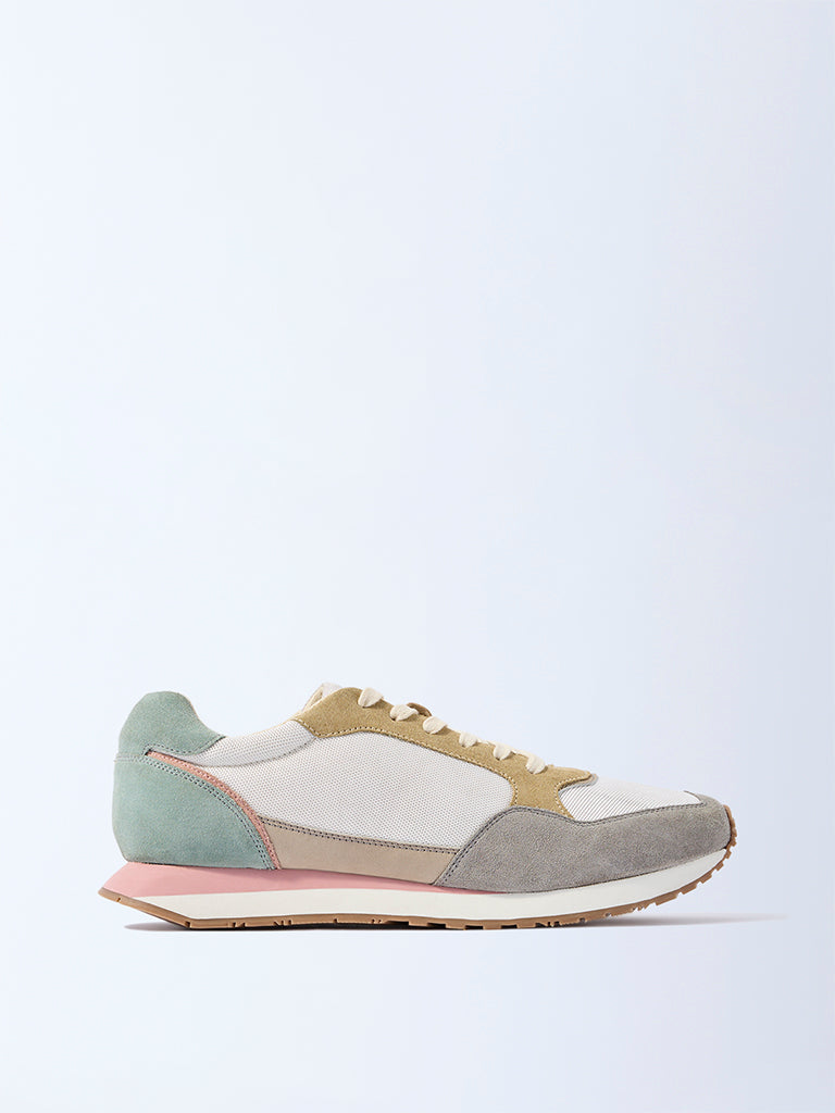 Luna Blu presents these multicolour sneakers, crafted with suede overlays and soft pastel accents for a fresh, contemporary vibe. Designed with a lace-up fastening for a secure fit, they feature a padded insole that ensures day-long comfort. Finished with a durable, textured outsole, this versatile pair blends sporty ease with modern style, making it a chic addition to your casual wardrobe.