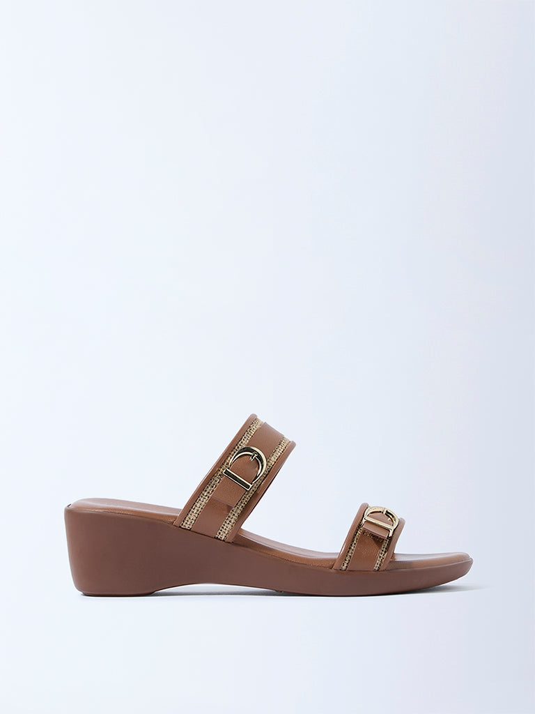 Elevate everyday dressing with these tan sandals from Luna Blu, defined by clean dual straps accented with raffia-inspired detailing and metallic buckles. Set on a low wedge heel that adds graceful height without compromising ease, they deliver both style and comfort. A cushioned footbed softens every step, while the textured outsole provides steady grip.