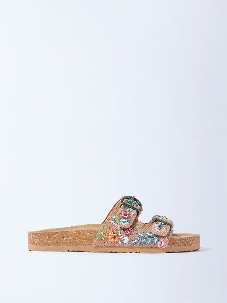 LUNA BLU Taupe Floral Raffia Detailed Slip-On Sandals