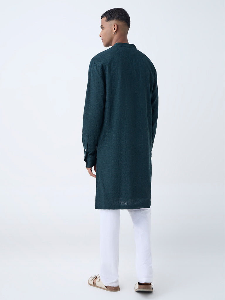 Festive simplicity defines this emerald green kurta from Kala by ETA. Tailored from a soft cotton-blend fabric with subtle embroidery, it features a round neck, button-down front, and full sleeves. Designed in a relaxed silhouette with functional side pockets, it delivers everyday comfort with an ethnic touch that’s perfect for celebratory occasions.