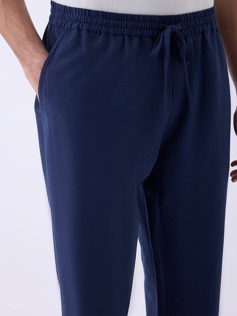 Anchor your festive wardrobe with these navy pants from Kala by ETA. Woven from a lightweight fabric, they offer breathable comfort while maintaining a relaxed silhouette. The elasticised waistband with adjustable drawstrings ensures a tailored fit, while multiple pockets lend functional utility.