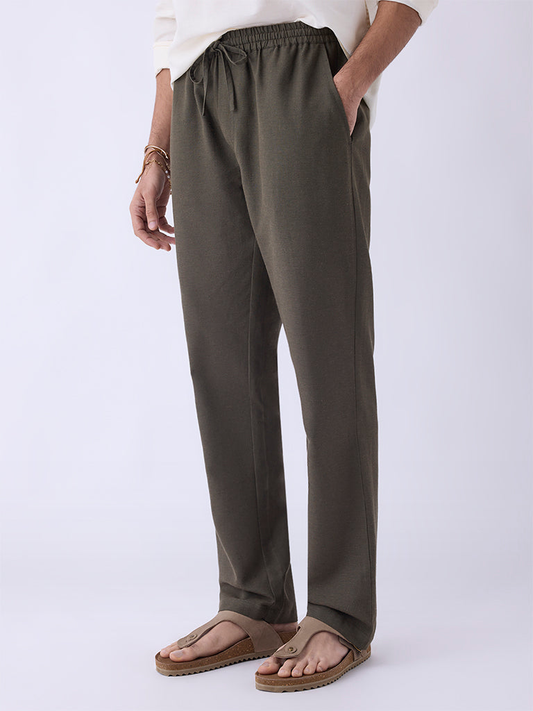 Mens Ethnicwear Olive Solid Relaxed-Fit Mid-Rise Pants