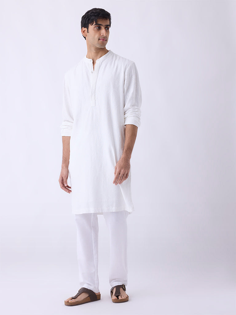 This pair of white pants from Kala by ETA balances traditional elegance with contemporary menswear sensibility. Spun from a lightweight fabric, they offer breathable comfort while maintaining a relaxed silhouette. The elasticised waistband with adjustable drawstrings ensures a tailored fit, while multiple pockets lend functional utility.