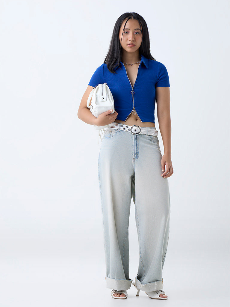 Bring a hint of modernity to your off-duty rotation with this blue t-shirt from Nuon. Crafted in a ribbed profile for a sleek, body-defining fit, it features a spread collar that extends to a zipper placket and short sleeves for a breezy finish.