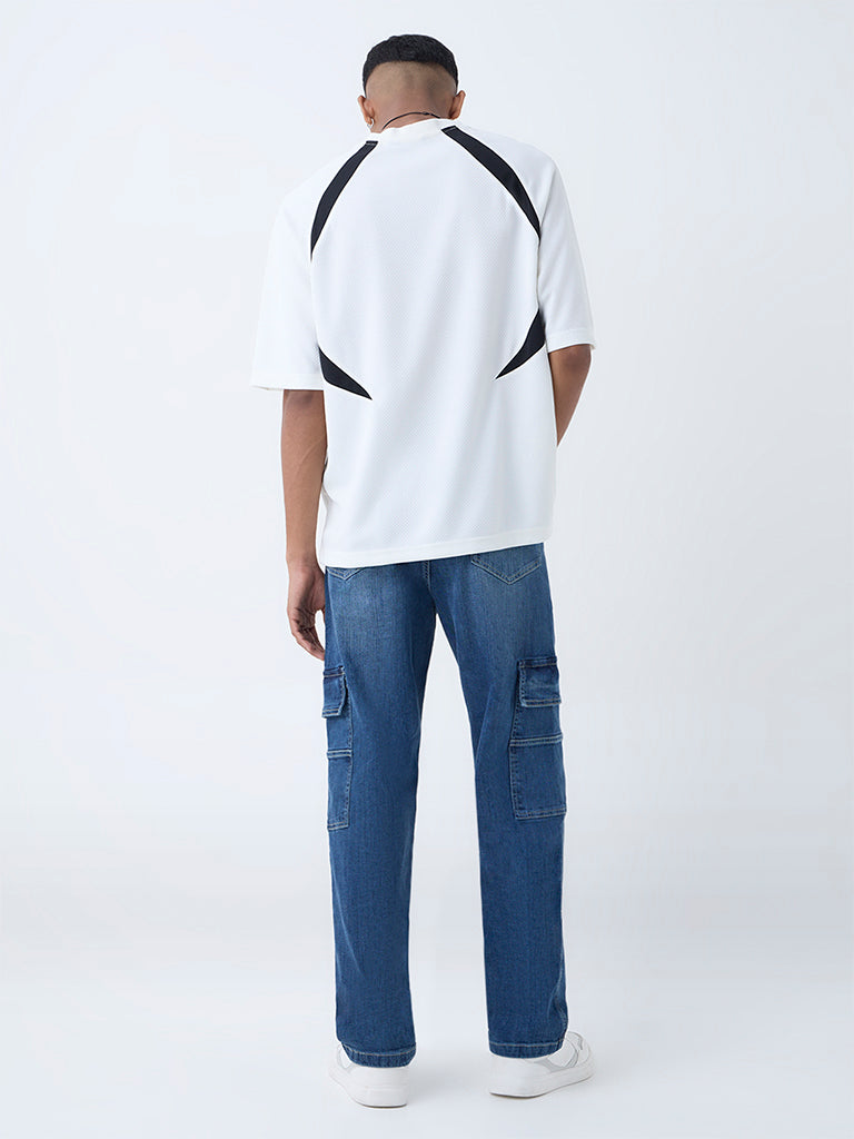 Rugged and practical, these dark blue washed cargo jeans from Nuon are cut from a durable cotton-blend fabric. Styled in a relaxed mid-rise silhouette with a buttoned waistband, zipper fly, belt loops, and multiple pockets, they offer a utilitarian edge while staying stylish and versatile.
